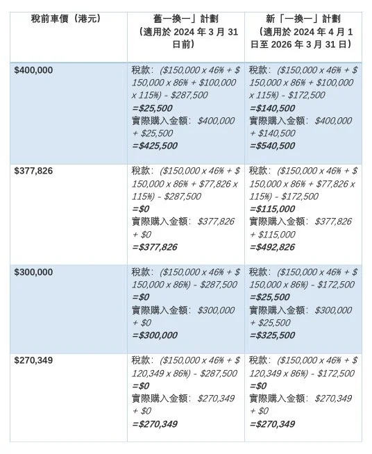 在新舊「一換一」計劃下,不同稅前車價的電動車實際購入所需金額如下: